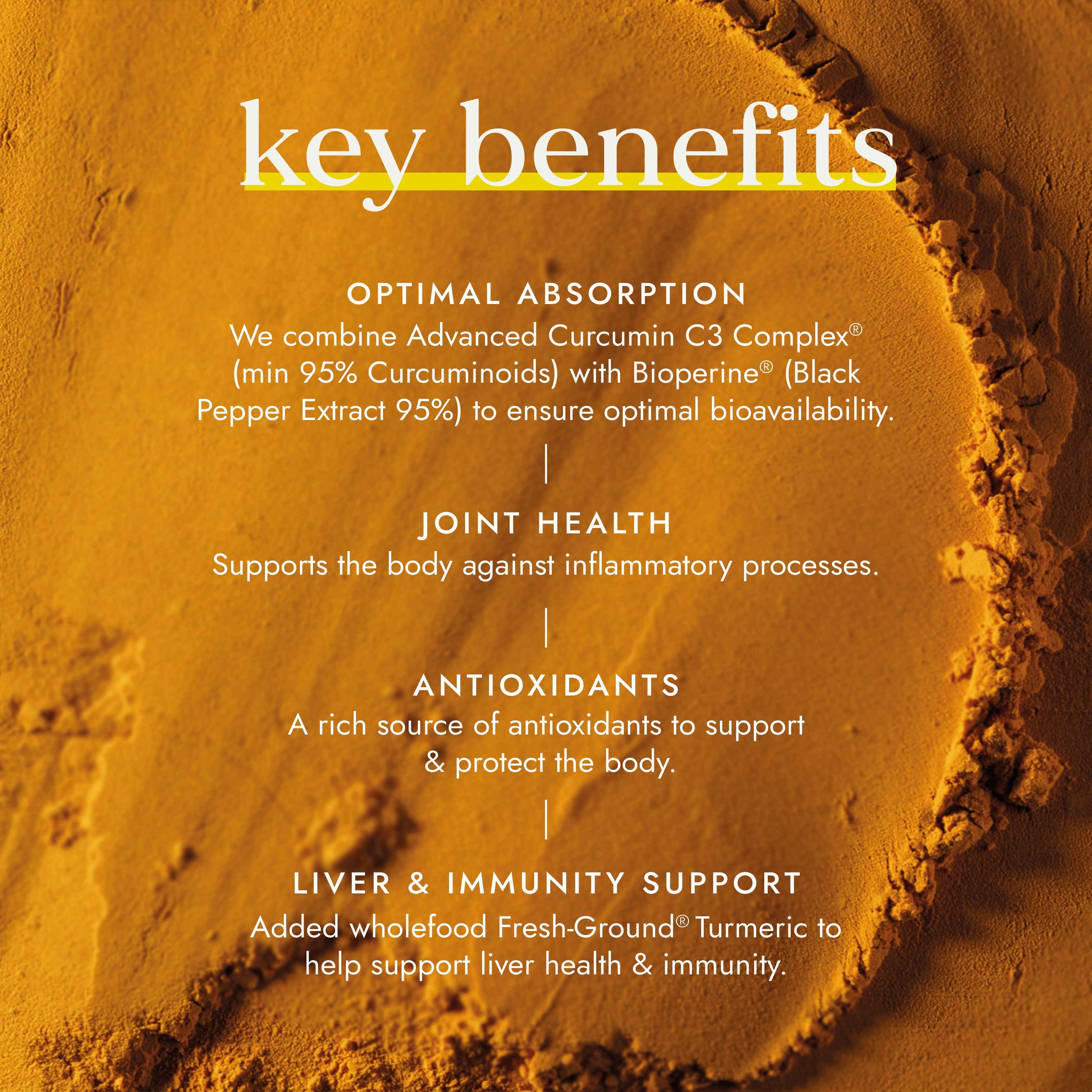 KEY INGREDIENTS: Advanced Curcumin C3 Complex® min 95% Curcuminoids, Bioperine® Black Pepper Extract 95%, highly bioavailable with added Wholefood Turmeric.
